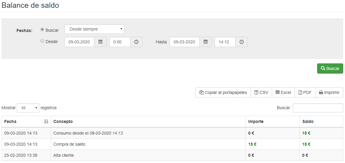 Desde el apartado de Balance de saldo, podrás llevar un control total del saldo de tu cuenta. En esta sección aparecerá un listado de todas las variaciones de tu saldo en las fechas escogidas, donde tendrás reflejadas todas tus compras de saldo, los consumos de saldo por realizar envíos SMS en caso que seas un cliente, o las asignaciones de saldo que realices a tus clientes en caso que seas un distribuidor.