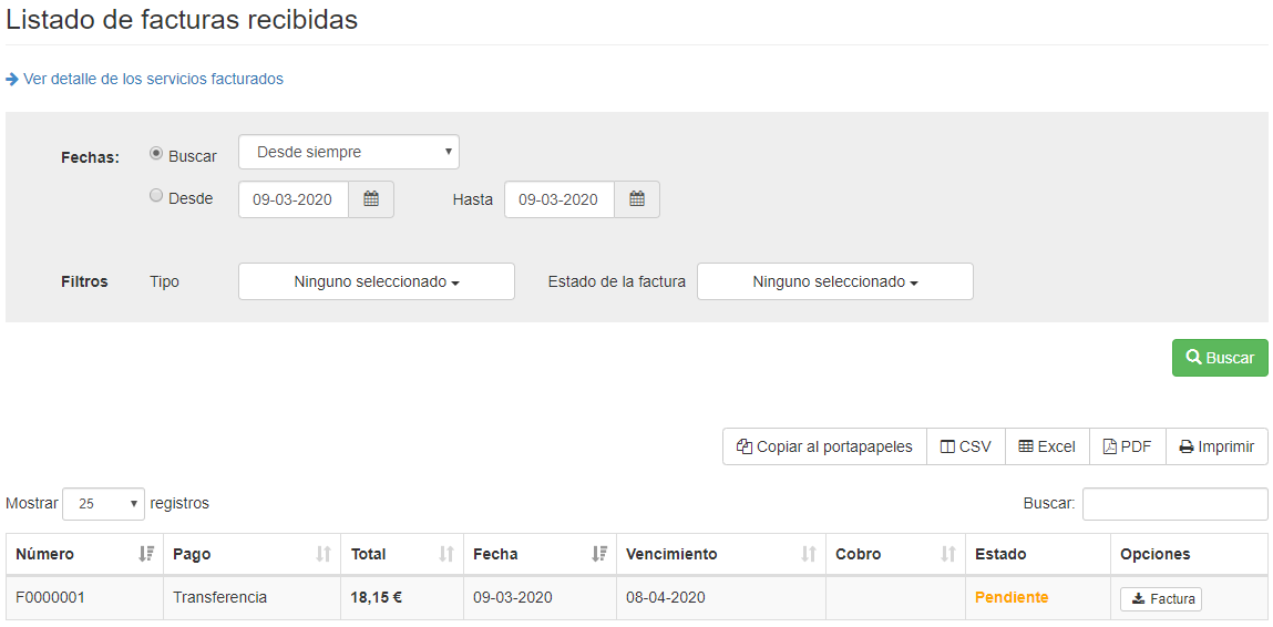 Si necesitas descargar cualquier factura de las compras que has realizado, puedes acceder al listado de facturas de tu cuenta donde podrás filtrar por fecha, tipo y estado de las mismas.