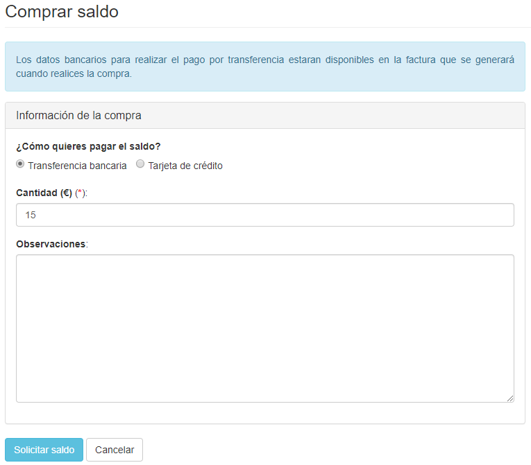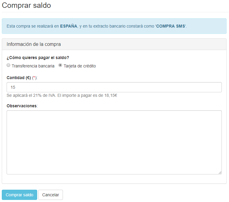 Tanto si eres cliente o eres distribuidor, si deseas adquirir saldo debes realizar una compra de saldo con la cantidad de € que quieras, pudiendo realizar el pago de la forma que más te convenga en ese momento.