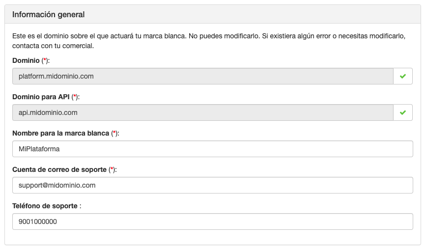 En esta sección podrás consultar el dominio que has escogido para la marca blanca y para la API y si apuntan correctamente.