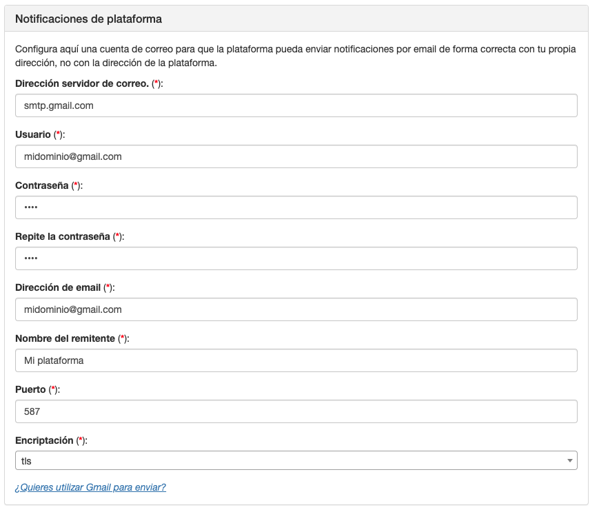 Es obligatorio configurar una cuenta de correo para que se puedan enviar las notificaciones que se generan en la plataforma.