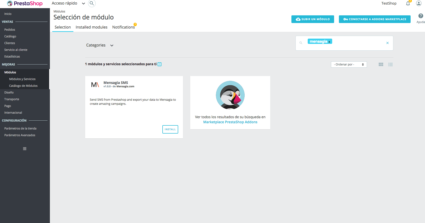 Si has copiado correctamente el módulo en su carpeta correspondiente, verás como aparece el módulo de Mensagia. Pulsa en el botón de instalar para que Prestashop lo instale automáticamente.