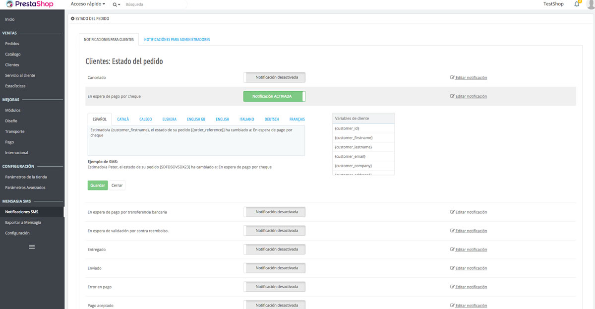 Una de las funcionalidades del módulo de Mensagia para Prestashop es el envío de notificaciones automáticas por SMS cuando se produce un evento en concreto.